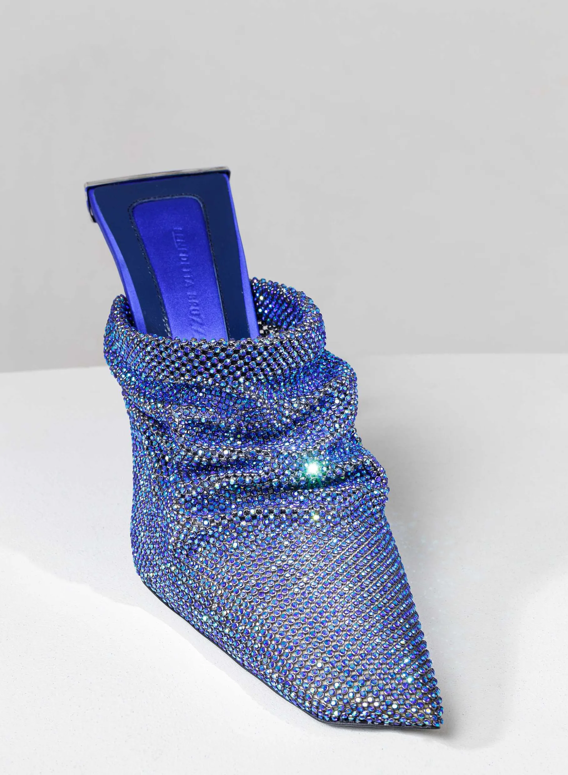 Goliarda Is A Creation With A Satin-Covered Structure And Crystal Mesh Upper. The Heel Of This Object D’Heart Recalls The Shape Of My Iconic Ariel. The Elegant Metal Detail On The Back Highlights The Sculpture-Like Structure Of The Shoe.