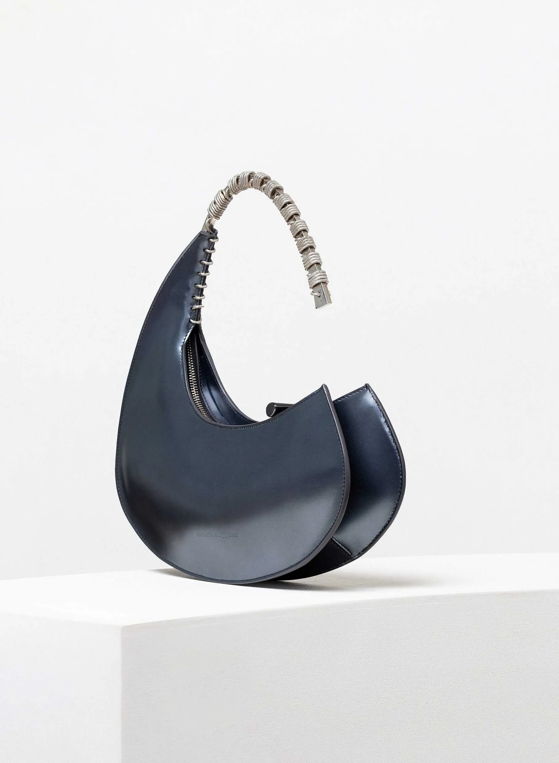 Organic And Technological. Organic Like Sepals Of An Orchid And Technological Together Like The Hulls Of A Catamaran, Raffaella Has A Body That Is A Leather Shell, Potbelly And Sharp, Supported By A Metal Handle Open To “C”, With An Irregular Profile, Obtained By Laser Cutting A Metal Plate Of 4 Mm. A Small Tubular, In Leather Or Metal, Combines Body And Handle As A Basting, Or If We Want As A Tendril On A Vine Shoot.