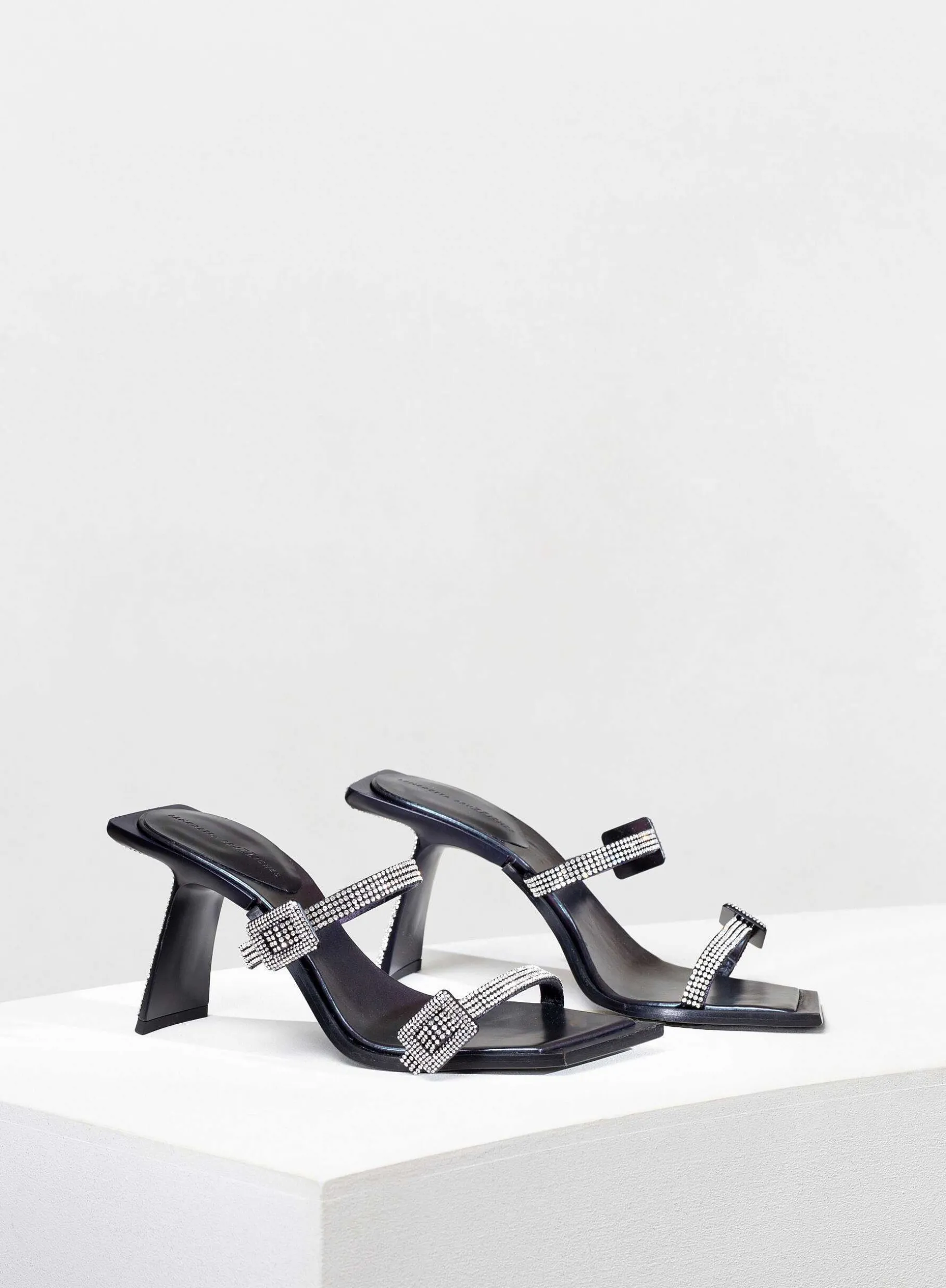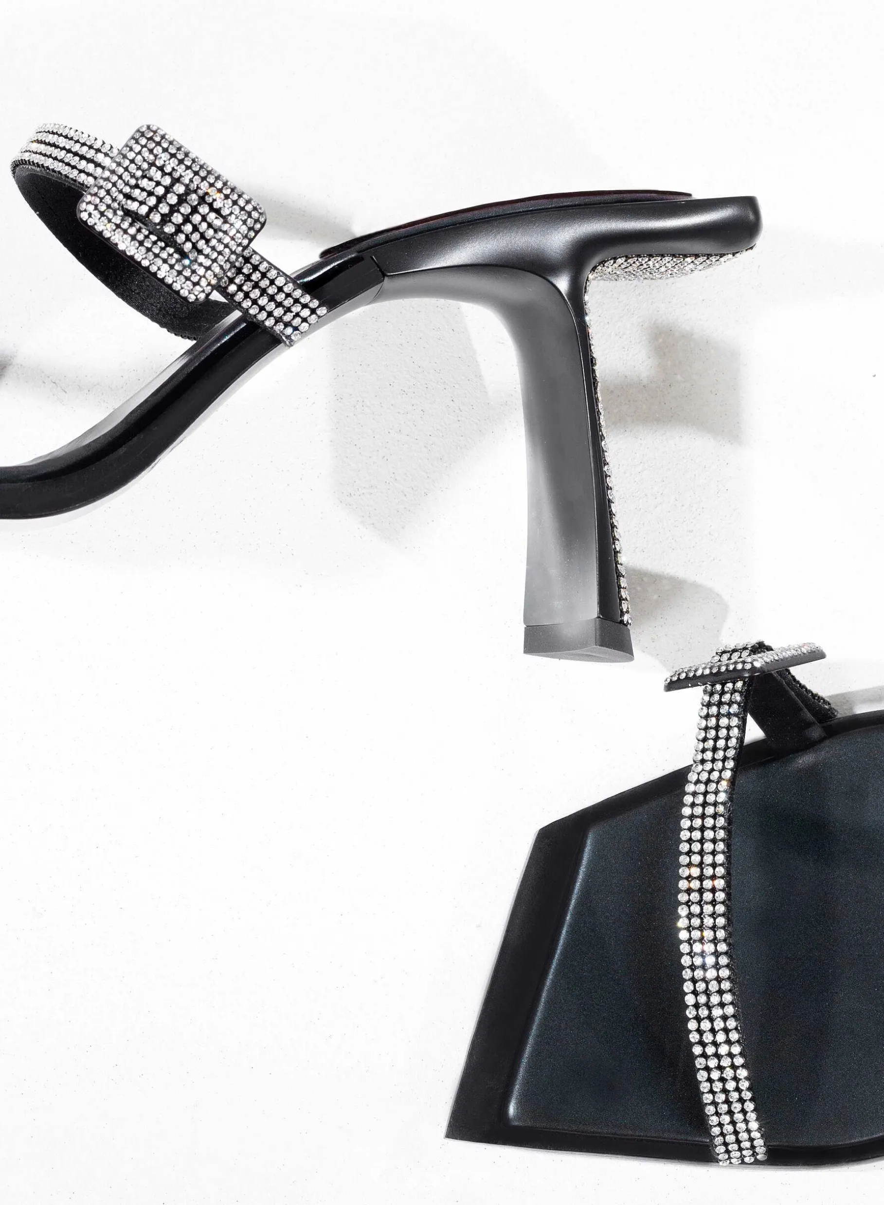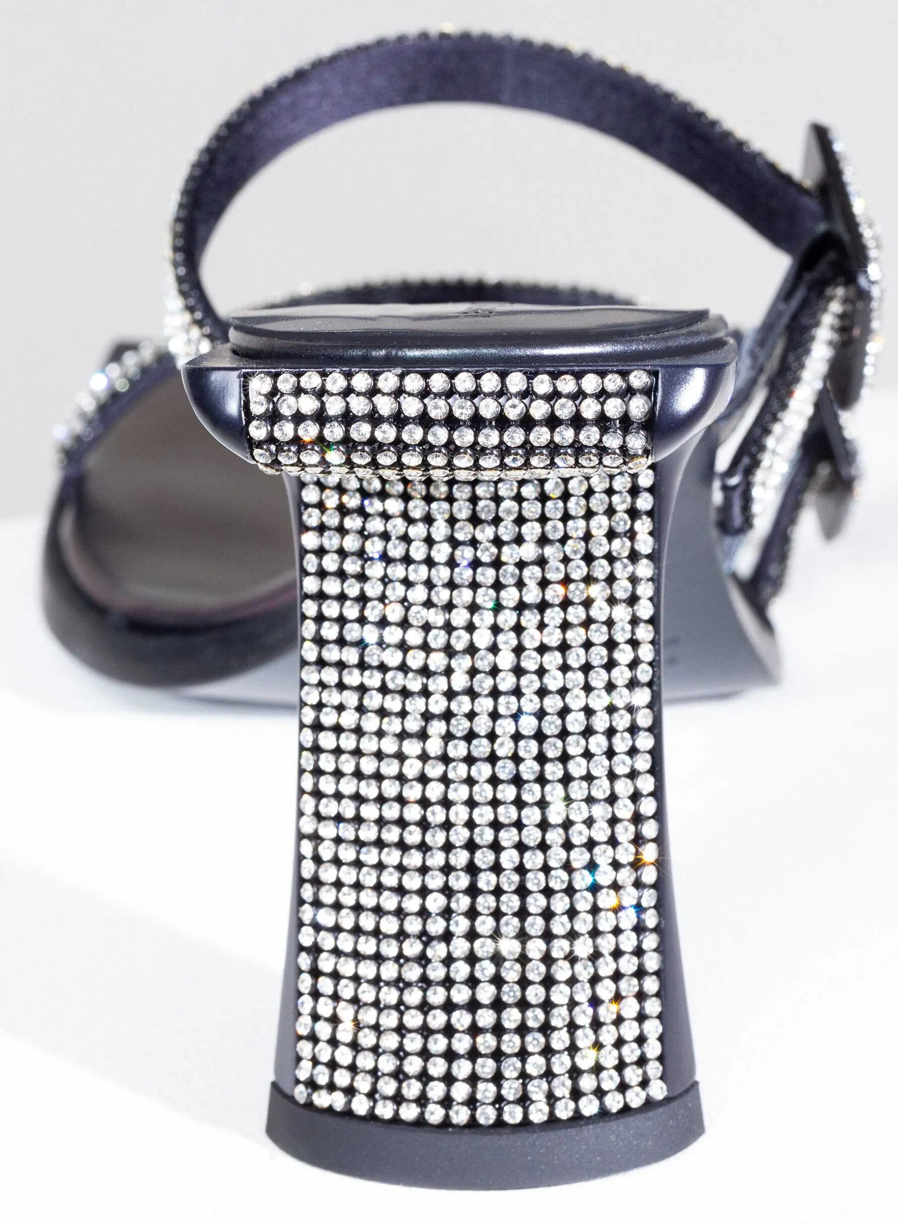 Two Satin Straps Adorned With Crystal Mesh Elegantly Wrap Around The Foot, While The Dynamically Inclined Heel Becomes An Unexplored Stage For Light.