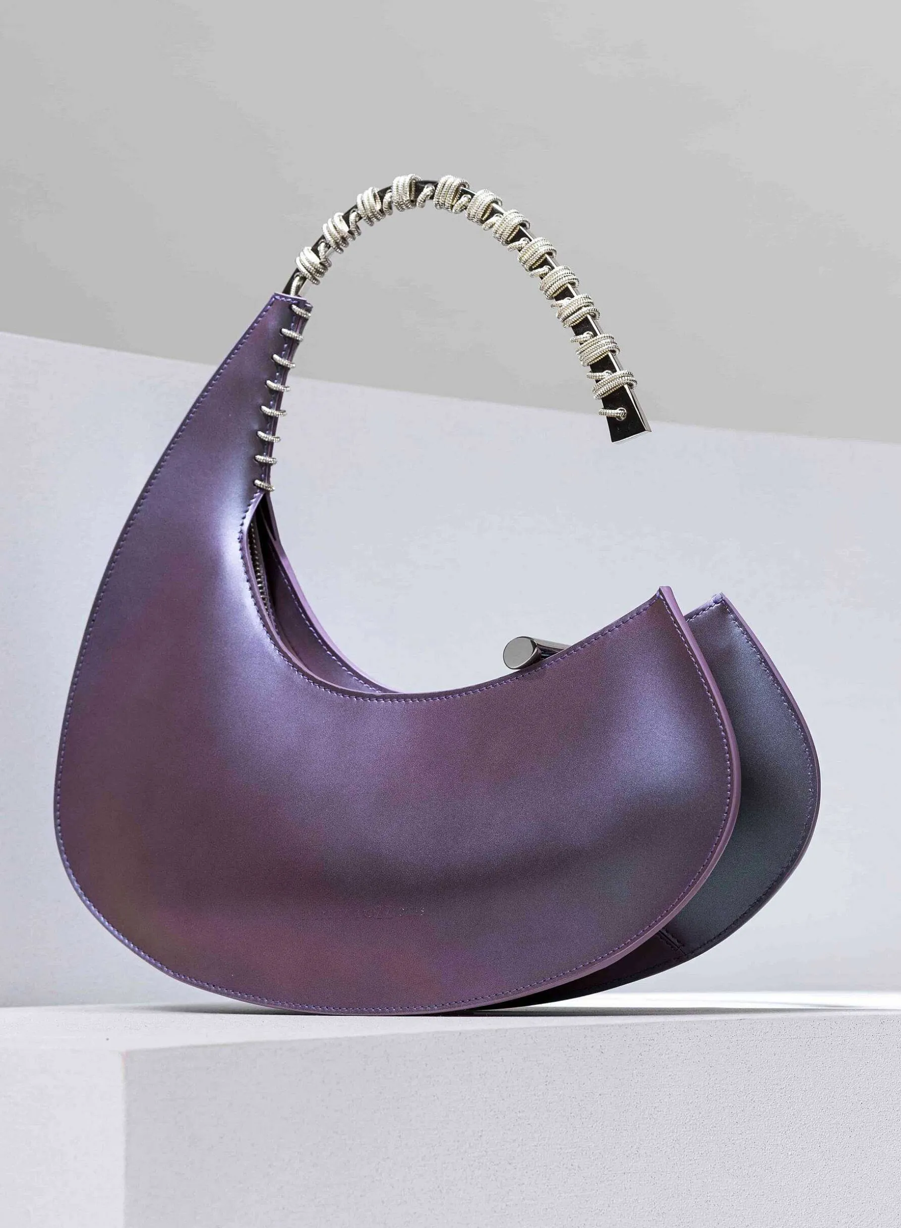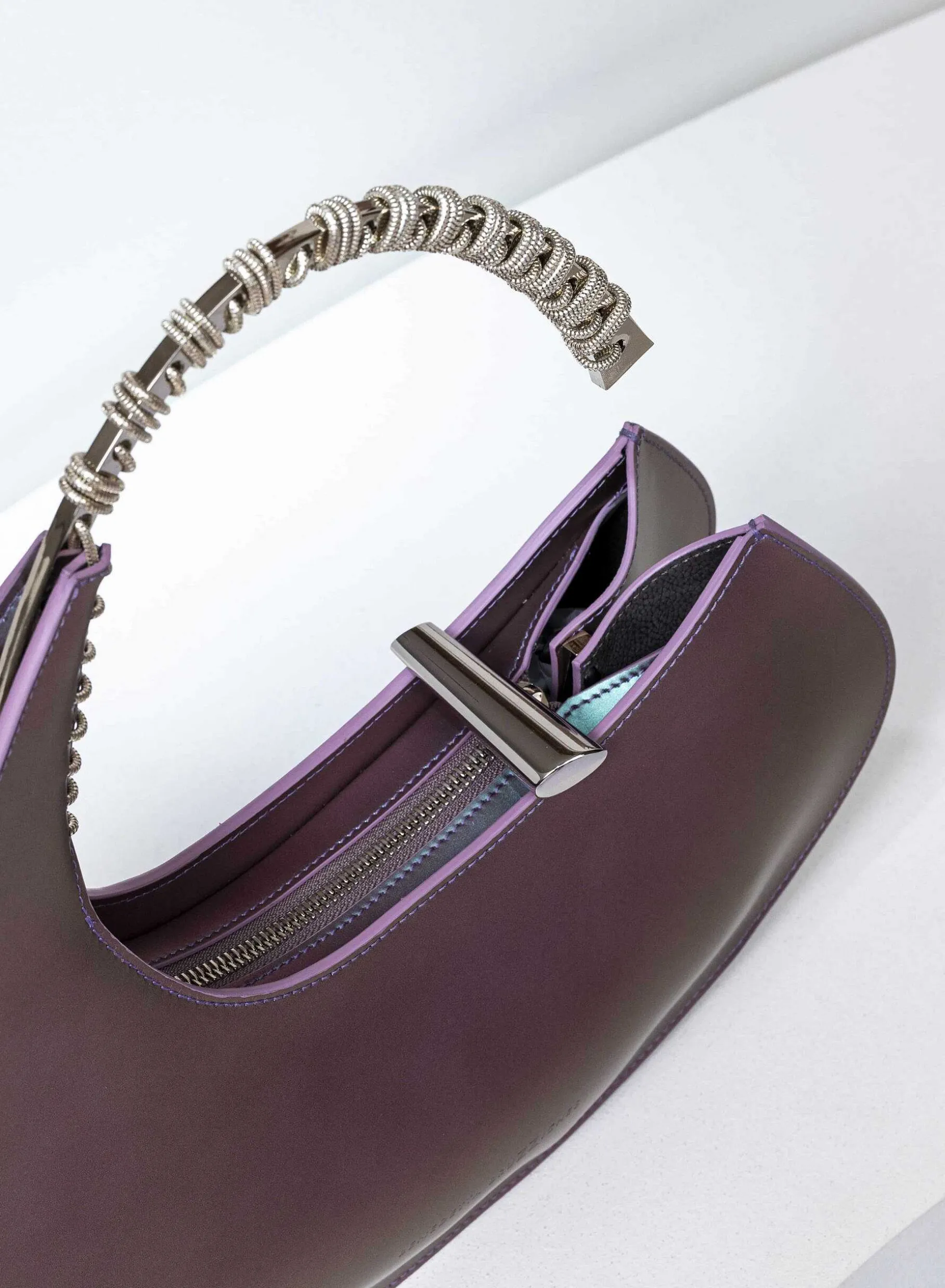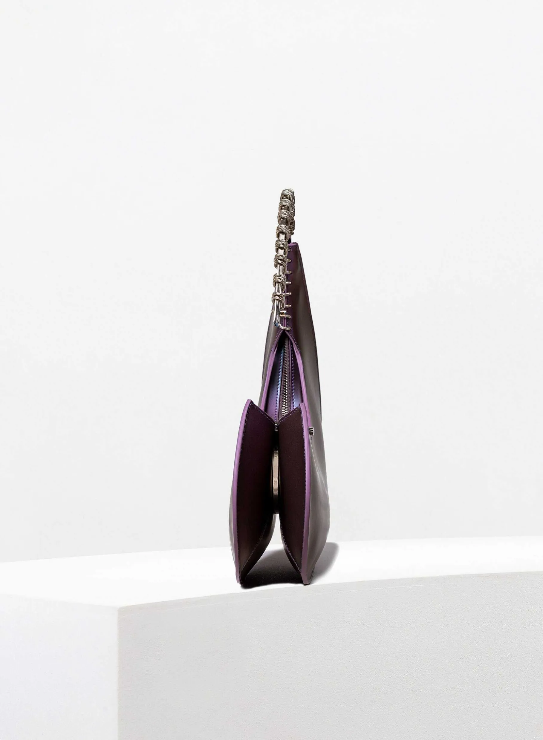 Organic And Technological. Organic Like Sepals Of An Orchid And Technological Together Like The Hulls Of A Catamaran, Raffaella Has A Body That Is A Leather Shell, Potbelly And Sharp, Supported By A Metal Handle Open To “C”, With An Irregular Profile, Obtained By Laser Cutting A Metal Plate Of 4 Mm. A Small Tubular, In Leather Or Metal, Combines Body And Handle As A Basting, Or If We Want As A Tendril On A Vine Shoot.